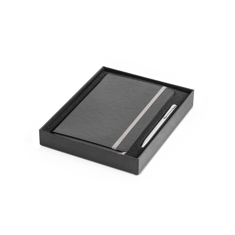 Set with ballpoint and A5 notepad. The ball point is in aluminium with an iron clip, twist mechanism and writing in blue. The A5 notepad has a hardcover, bookmark ribbon, elastic band, inner pocket and 160 ivory lined sheets. Set supplied in a gift box.Ball pen: ø10 x 138 mm | Notepad: 137 x 210 mm | Box: 190 x 240 x 30 mm