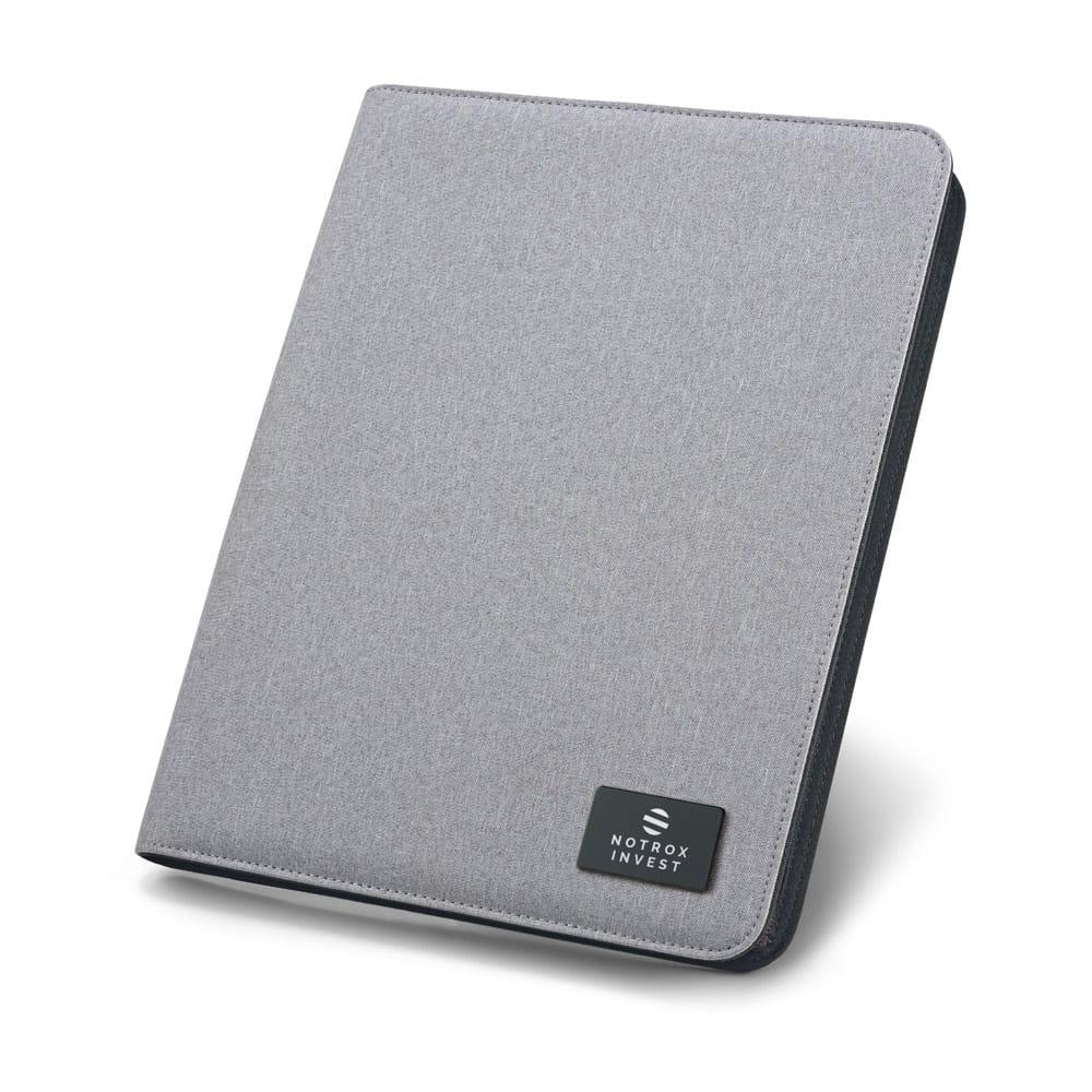 Imitation linen and imitation leather A4 folder. This folder has a customizable metal plate with a rubber finish, a pad (20 lined sheets), a pen holder (pen not included) and other compartments for accessories (not included).259 x 336 x 27 mm | Plate: 50 x 30 mm