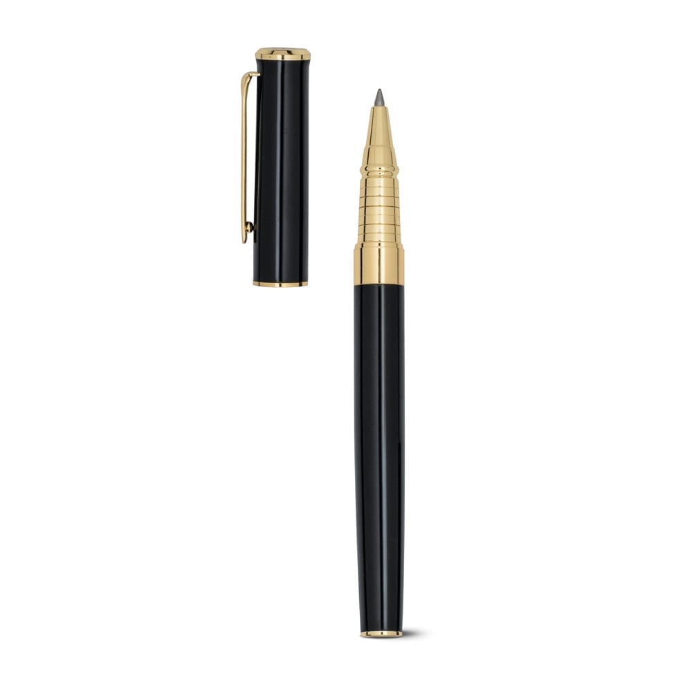 Set with metal roller and ball pen with 18-carat gold-plated elements. Supplied in a cushioned gift box. Black ink.ø12 x 136 mm | Case: 185 x 75 x 31 mm